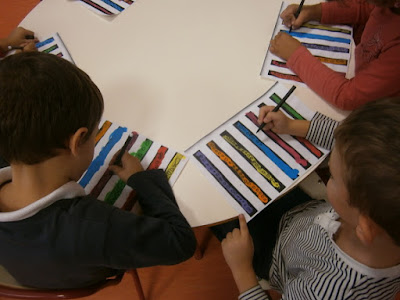 Una vez que las tiras estaban bien pegadas debían hacer pequeñas líneas verticales que unieran cada dos tiras. Desde el principio de la tira hasta el final. Todos lo hicieron fenomenal y aquí os dejo un par de ejemplos.