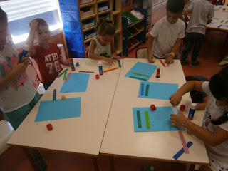 También debían de ir cogiendo las tiras en orden de menor a mayor, según los números pues los iban a tener que pegar en orden en un folio de color (a escoger libremente). Además debían dejar una separación entre cada tira de papel. Como primera sesión no estaba nada mal, jejeje. Pensaba que les costaría más pero me sorprendieron gratamente y... ¡¡MIRAD QUE MARAVILLAS!!